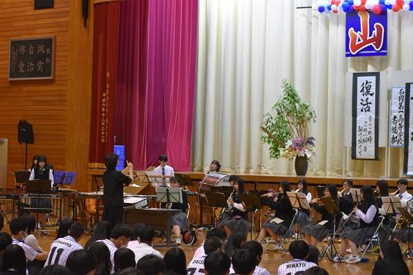 令和5年6月1日(木)・2日(金)本校開催の山王祭にて、コンクール曲やJpopなどを演奏しました。今回は、書道部・造園部・演劇部の皆さんともコラボし、素敵な演出の中、演奏をすることができました。